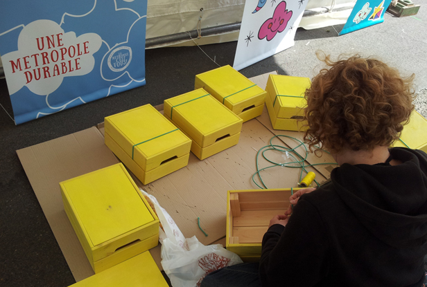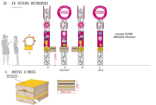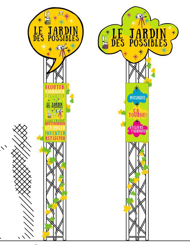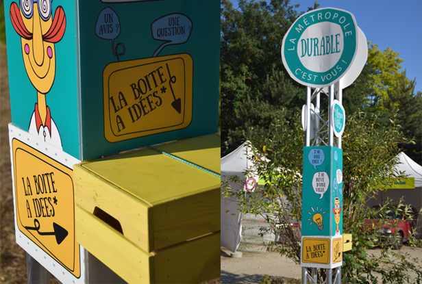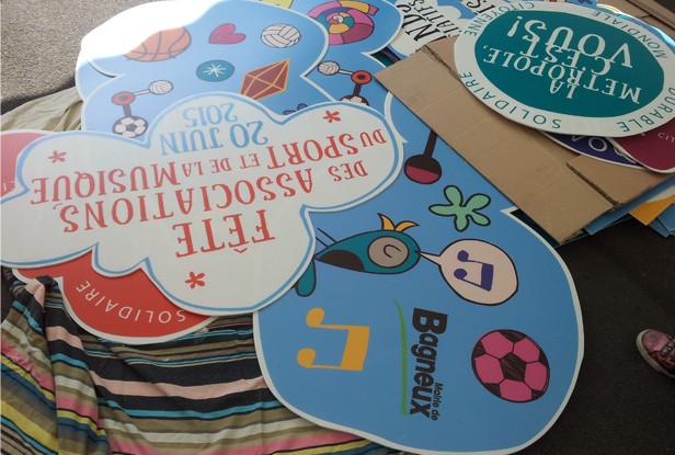 Scénographie de la fête des associations à Bagneux. Conception de totems avec urne de vote intégrée, création graphiques d’après charte graphique existante : panneaux, bâches accueil, macarons stands…Avec les Plastikeuses